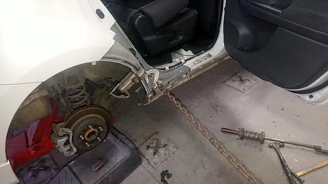 車両のパネルは、何枚か重なり強度を出しています。今回はインナー側まで損傷が見られますので、きちんと引き出していきます。